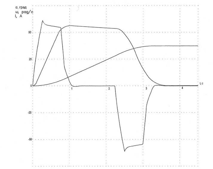 Рисунок 14. Графики переходных процессов скорости, угла поворота барабана и тока