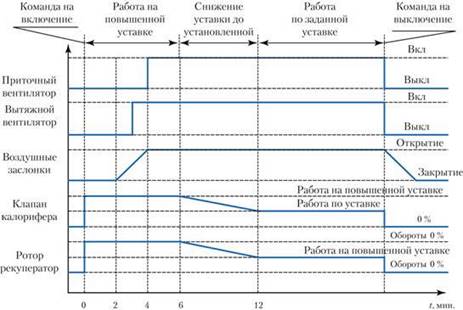 Резервирующие и дополняющие функции закладываются при работе в схеме нескольких одинаковых функциональных модулей (электрокалориферов, испарителей, холодильных машин), когда в зависимости от затребованной производительности включаются один или несколько элементов. Для повышения надежности устанавливаются резервные вентиляторы, электронагреватели, холодильные машины. При этом периодически (например, через 100ч) основной и резервный элементы меняются функциями, выравнивая, таким образом, их время наработки.На рисунке 1 показан типовой график включения и отключения аппаратов и устройств приточно-вытяжной системы. Весь этот цикл система должна отрабатывать автоматически, а, кроме того, должен быть предусмотрен индивидуальный пуск оборудования, который необходим при наладке и профилактических работах.