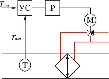 Эти функции выполняются с помощью замкнутых контуров регулирования, в которых принцип обратной связи присутствует в явном виде: информация об объекте, поступающая от датчиков, преобразуется регулирующими устройствами в управляющие воздействия. На рисунке 2 приведен пример контура регулирования температуры приточного воздуха в канальном кондиционере. Температура воздуха поддерживается водяным калорифером, через который пропускается теплоноситель. Воздух, проходя через калорифер, нагревается. Температура воздуха после водяного калорифера измеряется датчиком (Т), далее ее величина поступает на устройство сравнения (УС) измеренного значения температуры и температуры уставки. В зависимости от разности между температурой уставки (Tуст) и измеренным значением температуры (Тизм) устройство управления (Р) вырабатывает сигнал, воздействующий на исполнительный механизм (М – электропривод трехходового клапана). Электропривод открывает или закрывает трехходовой клапан до положения, при котором ошибка ε = Tуст – Тизм будет минимальной.