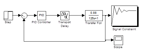 Для подбора параметров регулятора воспользуемся функцией подбора регулятора в программе Matlab. Собрав модель схемы регулирования, показанную на рисунке 7 и задавшись в блоке SignalConstraint выбранным типом переходного процесса, получаем параметры настройки регулятора Kd=-94.7979, Ki=39.9194, Kp=271.2686.