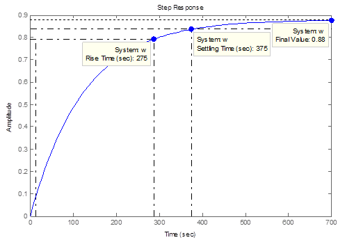 Таким образом, ПИД регулятор с выбранными настройками обеспечивает следующие показатели: время регулирования tрег=375с, время нарастания tн=275с. Установившееся значение выходной величины (