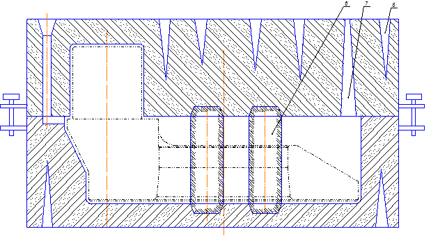 Рис. 4 Песчаная разовая форма в сборе (центральный стержень условно не показан): 6-стержни (образующие два отверстия по сечению Г-Г), 7- выпор, 8- вентиляционные отверстия.