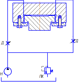 Рабочая жидкость, подаваемая насосом Н , под давлением, определяемым настройкой предохранительного клапана ПК , поступает через фильтр Ф и распределитель Р в левую полость гидроцилиндра ГЦ . Поршень цилиндра Ц находится в крайнем левом положении. После переключения распределителя Р жидкость подается в левую полость цилиндра Ц , давление в ней начинает расти, а в правой полости, которая соединяется через распределитель и регулятор потока РП с баком, давление падает. Регулятор потока РП обеспечивает постоянство скорости гидроцилиндра независимо от внешней нагрузки. Когда перепад давлений на поршне достигнет величины, достаточной для преодоления сил сопротивления поршень начинает двигаться. После того как поршень достигнет крайнего правого положения, по команде от системы управления распределитель Р переключается, соединяя правую полсть цилиндра Ц с магистралью с давлением рм , а левую полость – через распределитель потока РП с баком. Поршень возвращается в исходное положение в той же последовательности. Далее цикл повторяется. Таким образом, как при прямом, так и при обратном ходе имеется начальный перепад давлений на поршне.