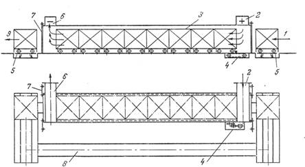 1 - вхід вологого матеріалу; 2 - вхід агента сушки; 3 - вагонетки;4 – механізм переміщення вагонеток; 5 – траверсний візок; 6 - вихід суміші, що відпрацювала; 7 – розсувні двері; 8 - обхід; 9 – вихід висушеного матеріалу.