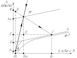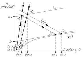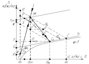 Результати графоаналітичного розрахунку не співпадають з аналітичним. Це пов’язано з тим, що h-d діаграма побудована для одного значення теплоємності сухих газів та пари, а у нашому випадку вони інші. Основним же фактором отриманої відмінності є неточність побудови процесів на діаграмі.