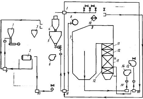 В котельных установках, работающих на пылевидном топливе, осуществляется также регулирование работы пылеприготовительной системы регулятором V загрузки мельниц, обеспечивающим постоянство загрузки шаровых барабанных мельниц и регулятором VI температуры пылевоздушной смеси за мельницей. Для предупреждения персонала о недопустимости отклонения важнейших параметров котельной установки от заданных служат звуковые и световые сигнализаторы предельных уровней воды в барабане, предельных температур перегретого пара и низшего давления питательной воды.