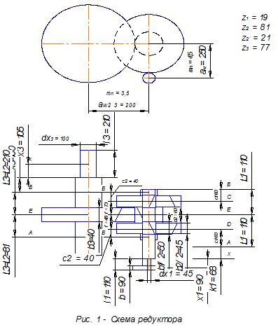 Быстроходная ступень редуктора – шевронная, раздвоенная с эвольвентным зацеплением, исходный контур по ГОСТ 13755-81. Тихоходная ступень – косозубая с круговинтовым дозаполюсным зацеплением Новикова, исходный контур по ГОСТ 15023-76.