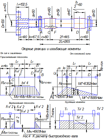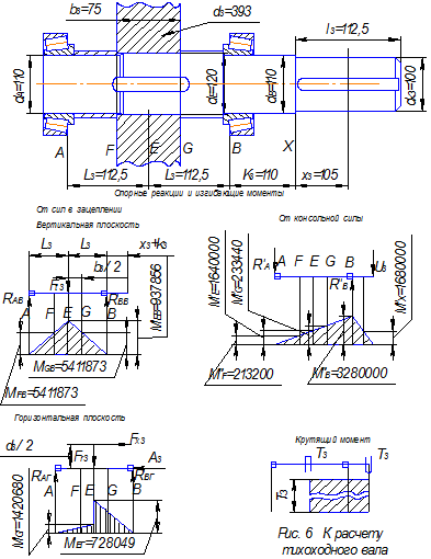 Расчетные приведенные напряжения (п.п. 12.5, 13.4, 14.5) близки к допускаемым в сечениях Х и В тихоходного вала, для которых и произведем проверку.