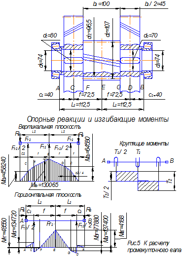 Сечения B и F имеют диаметр 70, из них сильнее нагружено B. Сечения G и E имеют диаметр 80 мм, из них сильнее нагружено G. Опасным может оказаться также сечение X, где диаметр равен 60 мм. Проверяем сечения X, B, G.