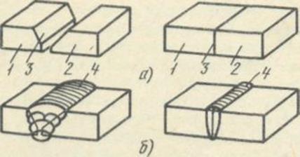 Сущность сварки плавлением (рисунок 1) состоит в том, что металл по кромкам свариваемых деталей 1и 2подвергается плавлению от нагрева сильным концентрированным источником тепла: электрической дугой, газовым пламенем, химической реакцией, расплавленным шлаком, энергией электронного луча, плазмой, энергией лазерного луча. Во всех этих случаях образующийся от нагрева жидкий металл одной кромки самопроизвольно соединяется с жидким металлом другой кромки. Создается общий объем жидкого металла, который называется сварочнойванной. После застывания металла сварочной ванны получается металл шва 4. Металл шва может образоваться только за счет переплавления металла по кромкам 3или дополнительного присадочного металла, введенного в сварочную ванну.