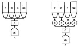 Рисунок 1.2 Схемы измельчения коксового сырья:а - обычная ДШ; б - дифференцированная ДК; С - смешение;УБ - угольная башня (склад измельченного сырья).