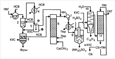 Газ после холодильника 4 освобождается от тумана КУС в электрофильтре 5 и соединяется с током газообразного аммиака из аммиачной колонны. Общий поток газа подается турбогазодувкой 1 через подогреватель 8 в сатуратор 9, барботирует через раствор серной кислоты. Выпавшие в сатураторе кристаллы сульфата аммония отделяются, а газ, после охлаждения в водяном холодильнике прямого смешения 10, направляется в абсорбер с насадкой 11, который орошается циркулирующим поглотительным маслом. В абсорбере из газа извлекается СБ, и раствор его в поглотительном масле (ПМ) направляется на ректификацию. СБ отгоняется из раствора, а регенерированное ПМ возвращается на абсорбцию. В холодильнике 10 из газа выделяется твердый нафталин, который экстрагируется из водной суспензии горячей КУС, подаваемой в нижнюю часть холодильника. Из абсорбера 11 выходит обратный коксовый газ (ОКГ).