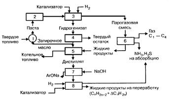 Процесс гидрогенизации твердых топлив может проводиться в жидкой или паровой фазе. Из многочисленных технологических схем жидкофазной гидрогенизации наиболее экономичной является циклическая схема. Она отличается от других меньшим расходом водорода, более низкими температурой и давлением процесса и позволяет полностью использовать все компоненты перерабатываемого сырья. Принципиальная схема подобной установки гидрогенизации приведена на рис.1.8.