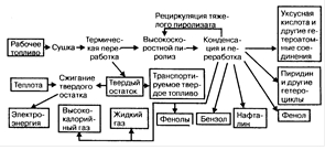 Повышение комплексности переработки углей и других видов твердого топлива для утилизации всех их компонентов и получения продуктов многоцелевого назначения. В качестве примера подобного производства приведена комплексная химическая переработка торфа (рис.1.10).