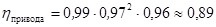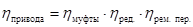 - суммарный КПД привода (значения берутся из таблицы - в ней КПД передач даны с учётом потерь энергии в опорах валов этих передач на подшипниках качения, т.е. при вычислении суммарного КПД привода, КПД пар подшипников не учитываются), вычисляемый по формуле:
