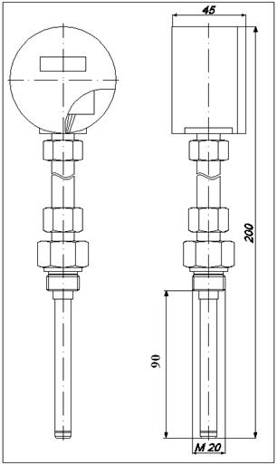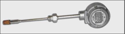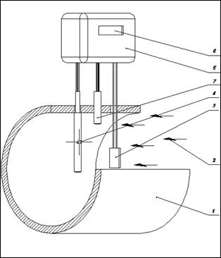 Датчик температури являє собою ємнісний перетворювач, діелектрична проникність якого залежить від вологості вимірювального середовища. Кріпиться до трубопроводу поз.1 та контактує безпосередньо з вимірювальним середовищем поз.2, в нашому випадку потоком газу. Більш детально принцип роботи перетворювача описано нижче.