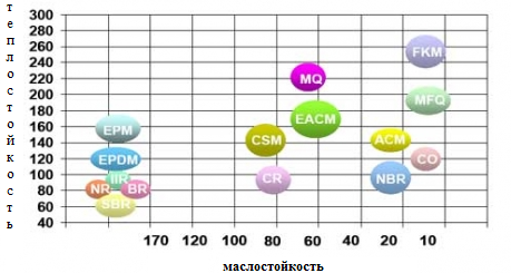 Сопоставление некоторых свойств каучуков общего и специального назначения представлены на диаграмме ниже. Ось абсцисс характеризует маслостойкость каучуков – ординат – теплостойкость.