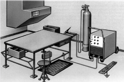 1- вентиляція; 2- робочий стіл; 3- ящик для електродів; 4- ящик для деталей; 5- діелектричний ковбик; 6- запальник; 7- газовий рукав; 8- стілець; 9- газовий балон; 10- прямий провід; 11- джерело живлення дуги; 12- заземлення; 13- зворотній провід; 14- ящик для відходів.