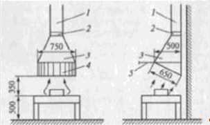 Рисунок 1.3. Схема відсмоктування газів, які виділяються при зварювальних роботах: 1- повітропровід; 2- шибер; 3- повітроприймач; 4- штампована решітка; 5- козирок.