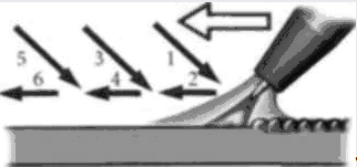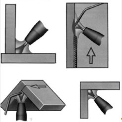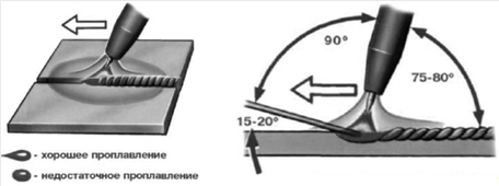 Здійснюють тільки один рух - уздовж осі шва. Відсутність поперечних коливань призводить до того, що шов стає вужчий, ніж при зварюванні покритими електродами. Щоб метал шва не насичувався киснем або азотом повітря, треба стежити, щоб кінець присадочного дроту і W-електрод постійно знаходився в зоні захисного газу. Щоб уникнути розбризкування металу кінець дроту подають у зварювальну ванну плавно. Про ступінь плавлення судять за формою ванни розплавленого металу. Хорошому проплавленню відповідає ванна, витягнута в бік напряму зварювання, а поганому - кругла або овальна.Зварювання зазвичай виконують справа наліво. При зварюванні без присадочного матеріалу електрод розташовують перпендикулярно до поверхні металу, що зварюється, а з присадним матеріалом під кутом. Присадний пруток переміщують попереду пальника без поперечних коливань (Рис.2.3).
