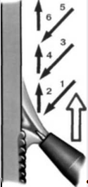 Горизонтальні шви виконують справа наліво "від себе" і "на себе". Зліва направо вести зварювання незручно. W-електрод направляють точно в кут. Присадочний дріт подають попереду пальника, коливальних рухів пальником і дротом не здійснюють(Рис. 2.5).