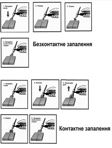 Існує 2 способи запалювання дуги: контактний (дуга між електродом і виробом виникає в результаті короткого замикання електроду на виробі) і безконтактний (дуга запалюється за допомогою високочастотного розряду, який створюється осцилятором) (Додаток А).