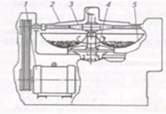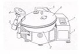 Рис. 1 Устройство куттера: 1 - электродвигатель; 2 - крышка; 3 - ножевой вал; 4 - червячная передача; 5 – чаша
