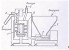Рис. 4. Вакуумный измельчитель ВИНД: 1 — бункер; 2 - шнековый насос; 3 — ножевая головка; 4— шнек выгрузки; 5— патрубок вакуум -насоса; 6 — чаша