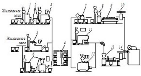После разделки и обвалки мясо направляют на жиловку: отделение соединительной ткани, кровеносных и лимфатических сосудов, хрящей, мелких косточек и загрязнений. Жилованное мясо на предприятиях малой мощности измельчают в волчке 1 и с помощью напольных тележек 2 транспортируют к смесителю 3, в которых производят посол. Посоленное мясо выгружают из смесителя 3 в напольную тележку и транспортируют в камеру созревания 4.