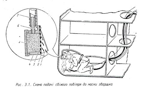 При роботі в замкнутих просторах і важкодоступних місцях рекомендується застосовувати пристрій для примусової подачі свіжого повітря під маску зварника (мал. 3.1).