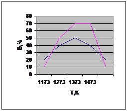 Приведена диаграмма технологической пластичности двух никелевых сплавов. Из диаграммы следует, что при 1 473 К происходит резкое падение пластичности сплавов. Если при диффузионной сварке жаропрочных сплавов в результате пластической деформации сжатия произойдёт течение металла, то в зоне соединения образуются трещины. Такое состояние возможно, несмотря на малые величины деформации при диффузионной сварке, так как с повышением температуры пластичность металла близка к нулю. Таким образом, верхний предел температуры сварки большинства жаропрочных сплавов не превышает 1 473 – 1 523 К. Остальные параметры режимов диффузионной сварки жаропрочных сплавов определяют так же, как и для других металлов, исходя из условий ползучести и диффузии.