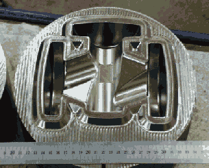 • максимальная скорость отработки УП системой ЧПУ. В связи с этим CAM-система должна уметь создавать проходы с маленьким шагом, которые будут выполняться на очень больших рабочих подачах. Для этого должны быть исключены резкие повороты, так как функция предварительного просмотра (look-ahead) системы ЧПУ автоматически уменьшает рабочую подачу в тех случаях, когда обнаруживает приближение точки смены направления движения. Целью является геометрически точное фрезерование изделий (например, деталей пресс-форм) с достижением такой шероховатости поверхности, чтобы финишная полировка была минимальной или даже полностью устранялась.