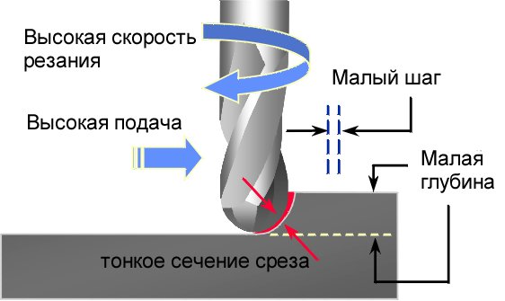 Эффект высокоскоростной обработки обуславливается структурными изменениями материала (из-за пластических деформаций, осуществляемых с большой скоростью) в месте отрыва стружки. При повышении скорости деформаций силы резания первоначально растут, а потом, с достижением определенной температуры в зоне образования стружки, вдруг начинают существенно снижаться. Самое замечательное, что время контакта режущей кромки с заготовкой и стружкой так мало, а скорость отрыва стружки столь высока, что большая часть тепла, образующегося в зоне резания, удаляется вместе со стружкой, а заготовка и инструмент просто не успевают нагреваться.