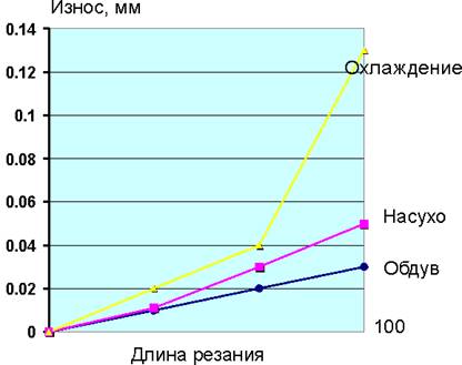 Интересный эффект увеличения стойкости инструмента при ВСО наблюдается при сравнении способов охлаждения. Как показывает график, наибольшая стойкость наблюдается при использовании обдува. Так как тепло концентрируется в стружке, ее надо просто быстро удалить из зоны резания. Низкая стойкость инструмента при охлаждении объясняют главным образом выкрашиванием, вследствие циклических термических нагрузок на режущую кромку инструмента. Постоянная тепловая нагрузка, даже на относительно высоких температурах лучше, чем меняющаяся циклическая нагрузка. Все что мы перечислили выше, относится к технической стороне ВСО.