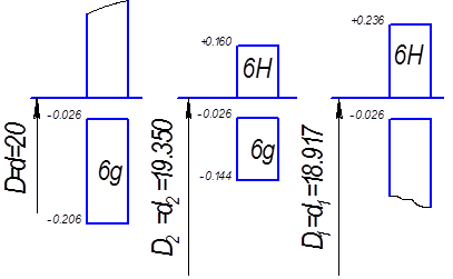 В рассматриваемом узле рассмотрим звездочку D1 = 20 мм. К этой резьбе не предъявляются высокие требования в отношении соосности или нагруженности, потому ее можно отнести к резьбам среднего класса точности. По (4, табл. 4.28) выбираем поля допусков по среднему классу точности для наружной резьбы (болта) и внутренней резьбы (гайки) соответственно 6g и 6Н.