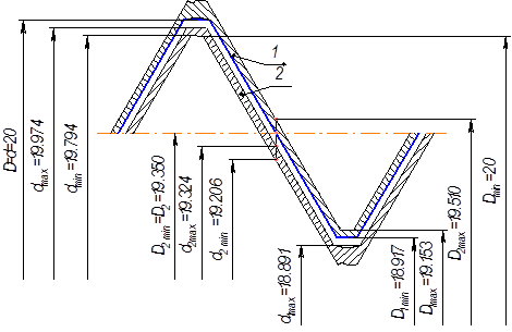 Номинальный диаметр резьбы является одновременно номинальным размером наружного диаметра D гайки и наружного диаметра d болта, т.е. D=d=20 мм. По (4, табл. 4.24) находим значения среднего диаметра гайки и болта D2=d2=19.350 мм и внутреннего диаметра D1=d1=18.917 мм.