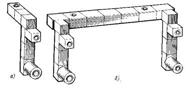 Ярусная литниковая система. Она состоит из одной, двух или нескольких секций каналов, соединяемых литниковым ходом, в который сталь поступает из одного или более стояков. Такую литниковую систему выкладывают из шамотного припаса. Трубки, выполняющие литниковых ход для отливок, получаемых в опоках, формуемых на машинах, имеют снаружи форму квадрата для удобства укладки на координатную плиту. Унифицированная секция литниковых каналов представляет собой один или несколько ярусов питателей, соединенных стояком, секции соединяются между собой литниковым ходом. На рис. 2, а показана типовая секция двухъярусной литниковой системы, на рис. 2, б – две такие секции, соединенные литниковым ходом. В качестве питателей для толстостенных отливок применяют круглые стандартные шамотные трубки. Внутренний диаметр трубки должен быть меньше толщины стенки отливки, к которой подводится питатель. При толщине стенки более 70 мм диаметр питателя 50-70 мм, в зависимости от массы отливки при толщине стенки менее 70 мм заливают через специальные унифицированные питатели (отсутствующие в ГОСТе) с размерами примыкающего к отливке сечения 20*90 или 40*120 мм, переходящего в круглое диаметром соответственно 50 и 70 мм.