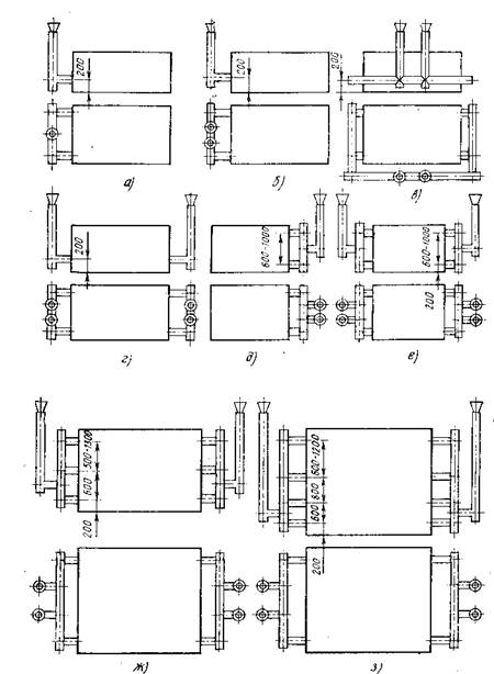 Для отливок прямоугольной формы одноярусные системы предусматривают: подвод металла с одной стороны отливки, заливку через один или два стояка (рис. 3, а, б ); подвод металла двух сторон отливки, заливку из одного и двух ковшей (рис. 3, в,г). Двухъярусные системы предусматривают подвод металла с одной стороны, заливку через два стояка (рис. 3, д), подвод металла с двух сторон, заливку через три или четыре стояка из двух ковшей (рис. 3,е). Трехъярусные и четырехъярусные системы обеспечивают подвод металла с двух сторон, заливку через три или четыре стояка из двух ковшей (рис. 3, ж, з).