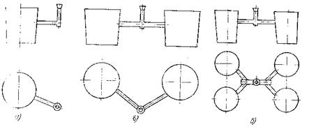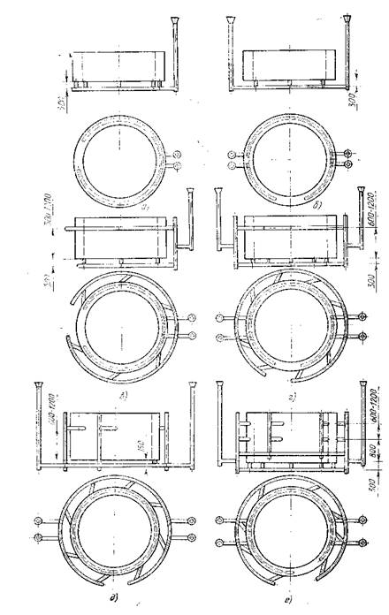 Для отливок, имеющих форму тел вращения, одноярусные системы предусматривают подвод металла с одной стороны, заливку через два стояка (рис. 4, а), подвод металла с двух сторон, заливку через три стояка (в форме выполняются четыре стояка, один из которых аварийный, рис. 4, б). Двухъярусные системы обеспечивают подвод металла с одной или двух сторон, заливку через два стояка из одного ковша и через три или четыре стояка из двух ковшей (рис. 4, в, г), а также через кольцевой щелевой питатель и два кольцевых литниковых хода (щелевой питатель образуется формой и внутренним стержнем рис. 4, д), трех- и четырехъярусные системы (рис. 4, е) – заливку через три или четыре стояка и два кольцевых литниковых хода из двух ковшей.