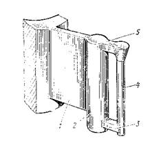 Литниковая система состоит из одной или двух унифицированных секций вертикально-щелевых питателей, соединяемых как и сифонная (рис. 2) литниковым ходом, и одного или двух стояков. Секция (рис. 6) представляет собой щелевой питатель 1, в который металл поступает из обратного стояка 2, соединенного сифонным питателем 3 или двумя питателями (сифонным 3 и верхним 5) с сифонным стояком 4. диаметр обратного стояка в 2 раза больше диаметра сифонного стояка.
