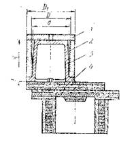 Прибыли с экзотермическим обогревом. Экзотермический обогрев прибылей представляет собой высокоэффективный метод улучшения их использования. Применение таких прибылей позволило, например, при изготовлении из стали 35ХМЛ ответственных отливок зубчатых втулок массой 6250 кг, с толщиной стенки 360 мм и эксцентриков массой 5290 кг, с толщиной стенки 100 мм улучшить использование металла, повысив выход годного литья соответственно с 52 до 72% и с 60 до 74%. Прибыли с экзотермическим обогревом выполняют в изготовленных из экзотермической смеси кольцевых стержнях и стаканах, помещаемых в формах вверх дном. Установка экзотермического кольцевого стержня на модели зубчатой втулки ( см. рис. 7 ) показана на рис. 9. Стержень из самотвердеющей экзотермической смеси упрочняется продувкой углекислым газом. Затвердевший стержень 2 устанавливают до уплотнения формы на верхнюю часть модели 3. Она препятствует разрушению стержня при встряхивании опоки и выполняет также нижнюю часть формы прибыли 4, которая не охватывается экзотермическим стержнем и не обогревается. Экзотермический стержень перекрывается стержнем 1, который удерживает формовочную смесь, находящуюся над прибылью. В центре стержня 1 делается отверстие, которое соединяется с находящимся над ним выпором.