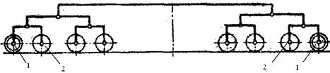 Рис. 1. Схема четырёхколёсных балансиров перегружателей:1 – приводное колесо; 2 – неприводное колесо