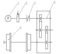 1- двигатель, 2- тормоз, 3- муфта, 4- редуктор, 5- колесо.