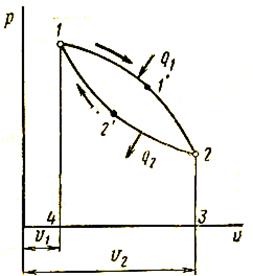 В процессе расширения газ совершает работу, измеряемую площадью 1-1′-2-3-4-1. Если газ сжимать при той же температуре, при которой он расширялся, то работа, затрачиваемая на сжатие, будет равна работе, получаемой при расширении, и в результате такого процесса работа будет равна нулю.