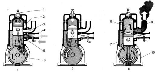 б) двухтактные. У этих двигателей рабочий цикл в каждом цилиндре совершается за два хода поршня или за один оборот коленчатого вала.