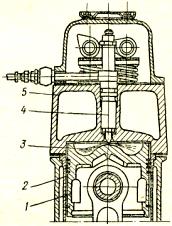 Давление масла в двигателе контролируется при помощи электрического датчика. В прогретом двигателе при 5600 об/мин коленчатого вала и температуре 85°С нормальное давление масла должно быть в пределах 3,5...4,5 кгс/см2 . В случае падения давления масла до 0,4—0,8 кгс/см2 контрольная лампа с красным светофильтром, расположенная на щитке (комбинации) приборов, загорается и сигнализирует об аварийном падении давления масла.