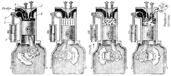 а) четырехтактные. У этих двигателей рабочий цикл совершается за 4 хода поршня или за 2 оборота коленчатого вала;