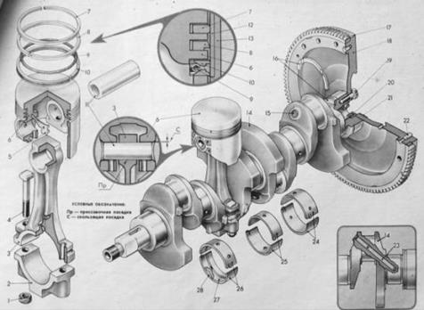 1 — гайка крепления крышки шатуна, 2 — крышка шатуна, 3 — шатун, 4 — шатунный болт, 5 — терморегулирующая пластина поршня, 6 — поршень, 7 — верхнее компрессионное поршневое кольцо, 8 — нижнее компрессионное поршневое кольцо, 9 — пружина маслосъемного кольца, 10 — маслосъемное поршневое кольцо,11 — поршневой палец, 12 — гильза цилиндра, 13 — цилиндр двигателя, 14 — пятиопорный коленчатый вал, 15 — заглушка масляного канала, 16 — упорные шайбы заднего коренного подшипника, 17 — зубчатый обод маховика (шестерня с прямым зубом— 129 зубьев), 18 — махойик коленчатого вала, 19 — болт крепления маховика, 20 — передний подшипник ведущего вала коробки передач, 21 — шайба маховика, 22 — центровочный штифт установки механизма сцепления, 23 — канал подачи смазки от коренного подшипника коленчатого вала к шатунному, 24 — вкладыши третьего центрального (среднего) коренного подшипника, 25 — вкладыши шатунного подшипника, 26 — вкладыши коренного подшипника, 27 — антифрикционный слой (сплав 20% олова и 80% алюминия), 28 — стальная лента; Пр — прессовая посадка, С — скользящая посадка