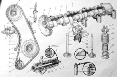1 — коленчатый вал, 2 — ведущая звездочка коленчатого вала, 3 — роликовая цепь привода, 4 — установочные метки, 5 — звездочка валика привода, 6 — башмак натяжного устройства, 7 — вулканизированная резиновая накладка, 8 — плунжер, 9 — корпус натяжного устройства, 10 — головка цилиндров, 11 — фиксирующая гайка, 12— ведомая звездочка распределительного вала, 13—успокоитель цепи, 14 — упорный фланец, 15 — кулачок распределительного вала, 16 — распределительный вал, 17 — опорная шейка вала, 18 — корпус подшипников распределительного вала, 19 — сухарь клапана, 20 — тарелка пружины клапана, 21 — наружная пружина клапана, 22 — внутренняя пружина клапана, 23 — опорная шайба внутренней пружины клапана, 24 — опорная шайба наружной пружины клапана, 25 — направляющая втулка клапана, 26 — маслоотражательный колпачок, 27 — жаростойкая наплавка, 28 — выпускной клапан, 29—регулировочный болт,30 — контргайка, 31 — пластина крепления пружины, 32 — рычаг привода клапана, 33 — пружина рычага, 34 — резьбовая втулка, 35 — впускной клапан, 36 — шайба пружины, 37 — зажимной сухарь стержня, 38 — пружина стержня, 39 — стержень натяжного устройства, 40 — пружина плунжера