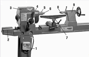 Весь механізм верстата укріплений на станині, зробленій з двох сталевих брусів або з профільних чавунних або алюмінієвих балок. З одного боку станини розташовується передня бабка, усередині якої розміщений електричний двигун (0,5-1,5 к. с.), що обертає шпиндель. Останній має конус Морзе, в нього може вставлятися повідковий центр (з двома, трьома або чотирма ножами і одним вістрям), патрон або планшайба. З другого боку верстата знаходиться задня бабка, центр якої підтискає заготівку, утримуючи її в горизонтальному положенні.